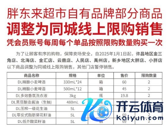 新浪科技讯 12月31日下昼音问开云kaiyun,胖东来当天发布见知称,胖东来超市自有品牌部分商品治愈为同城线上限购销售,凭会员账号每周每个单品按照限购数目购买一次。见知称为了让顾主有序的购物,保险卖场安全,自2025年1月1日起,许昌地区金三角店、北海店、金汇店、云鼎店、东谈主民店、禹州店,新乡地区大胖店、小胖店以下商品治愈为同城线上限购销售,其他门店暂停销售。