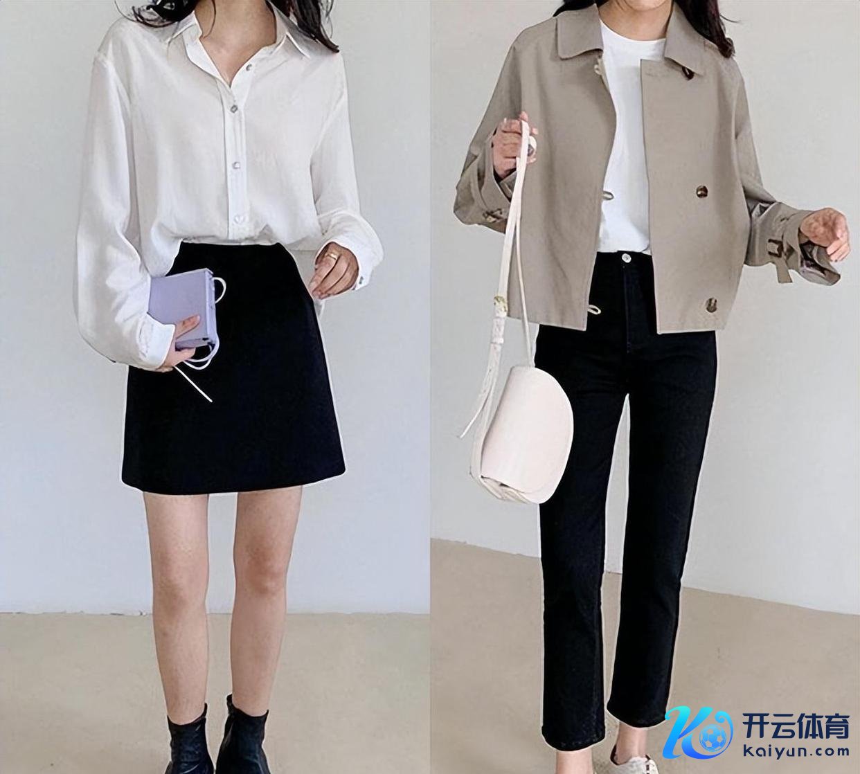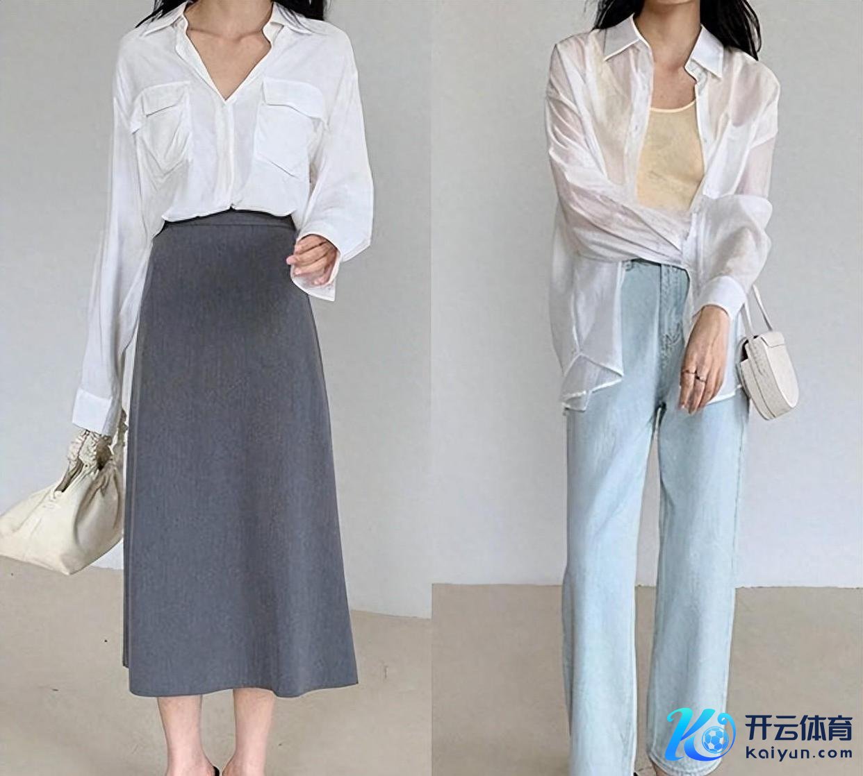 组合1:一袭白色衬衫配以灰色高腰裙装,彰显优雅风姿,活动端淑。